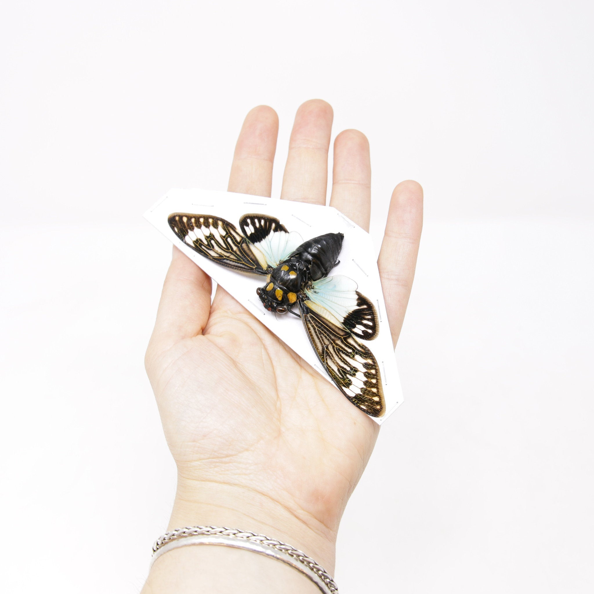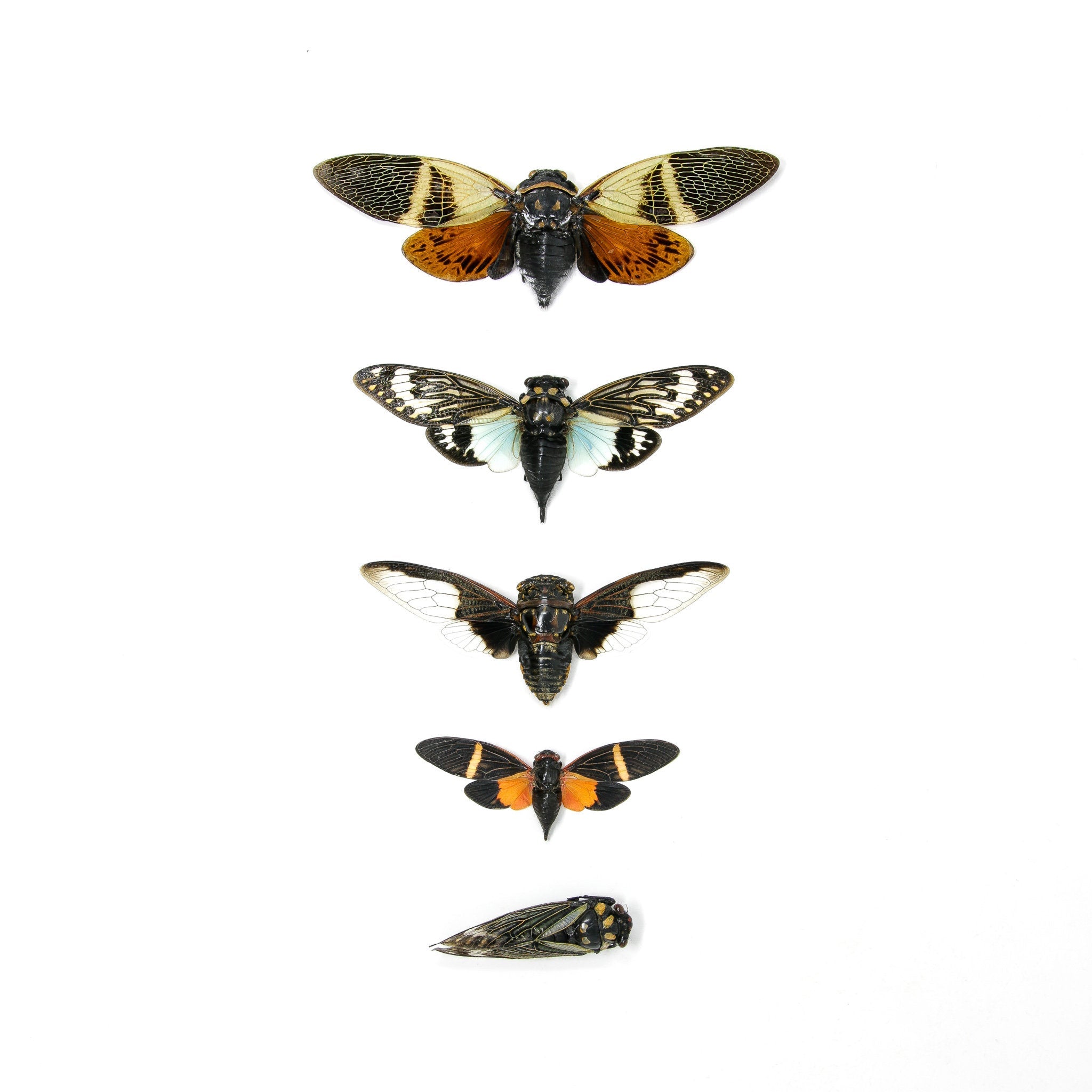 Five stunning A1-grade cicada specimens, each hand-selected for colour, size variation, and visual impact. These ethically sourced tropical insects are perfect for building a diverse entomology collection, crafting bespoke taxidermy art, or capturing compelling natural history photography. Their intricate wing structures and vibrant markings make them equally at home in a gallery display or a designer's studio.