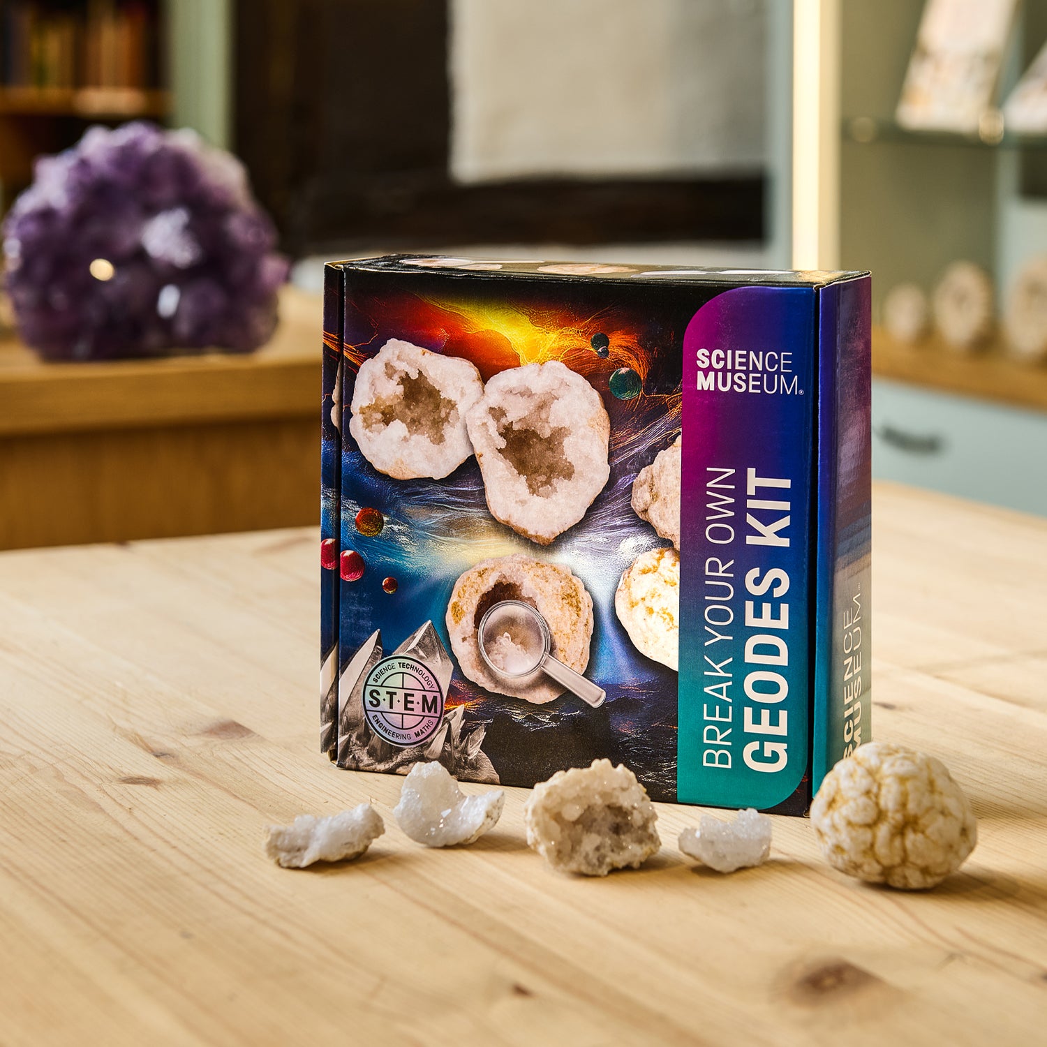 This hands-on discovery kit combines authentic specimens with the tools needed for safe exploration: protective goggles, a clear safety bag for controlled breaking, and a magnifying glass to examine quartz, calcite and other mineral structures up close.