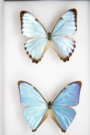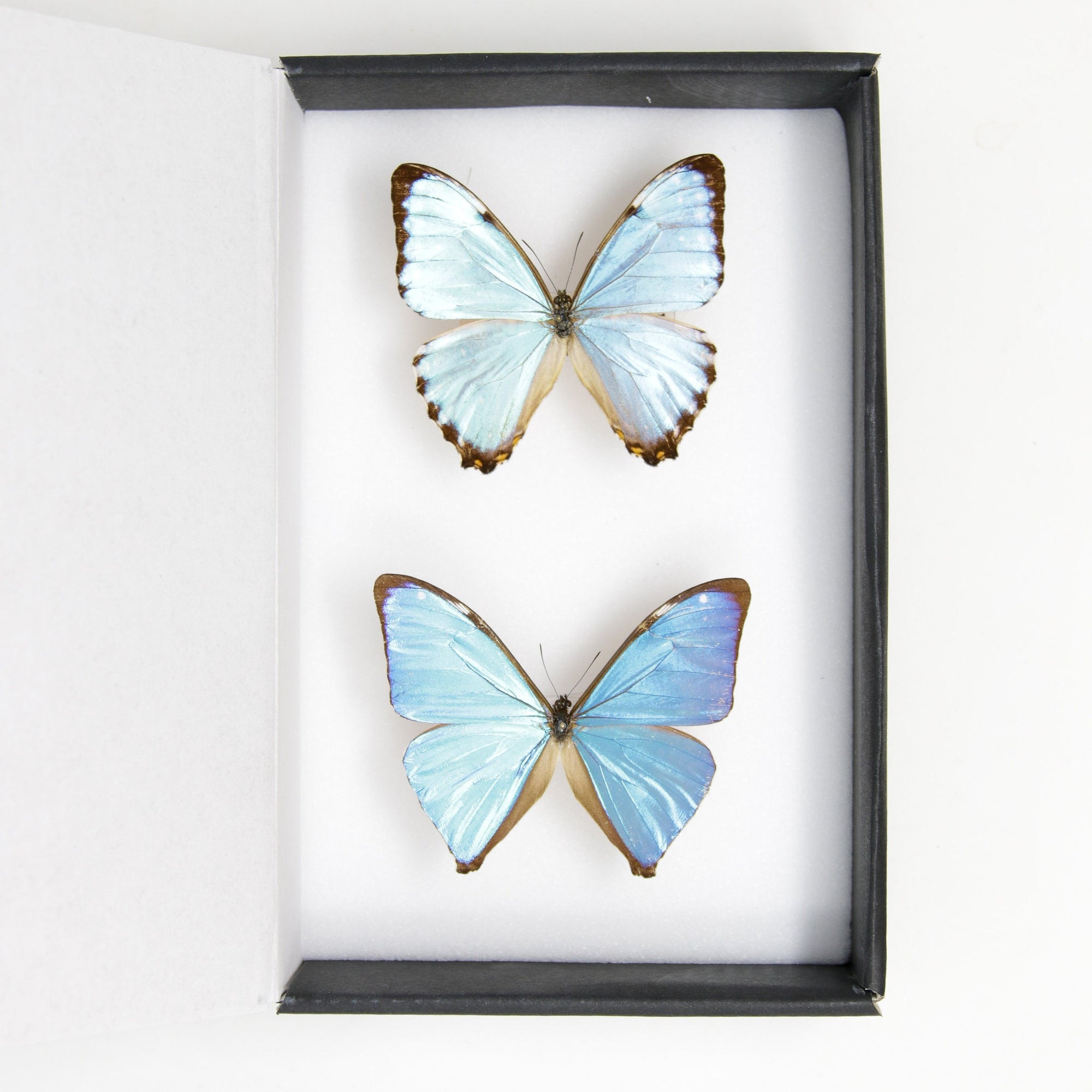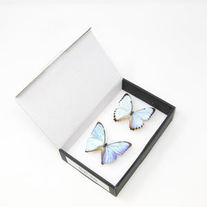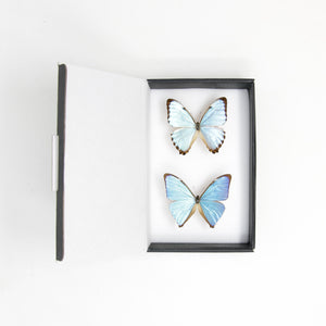 Two Morpho butterflies, expertly set and pinned, presented in a simple entomology box for safe transportation. A very nice example of this species. Free first class shipping.