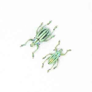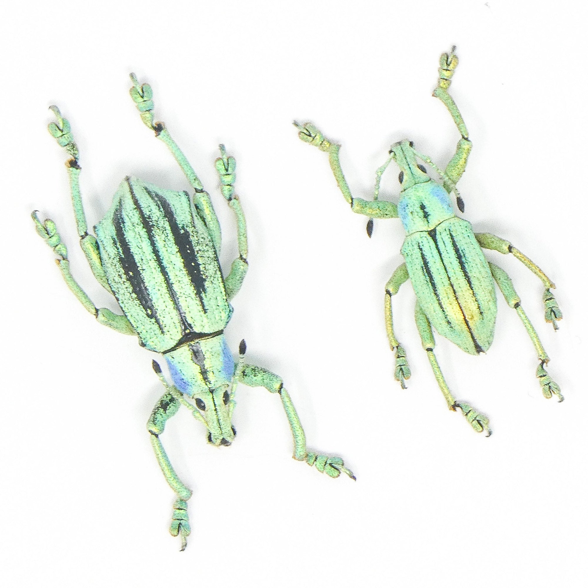 A stunning pair of Eupholus cuvieri weevils sourced from Mt. Arfak, West Papua, Indonesia. These exceptional A1-grade specimens showcase the species' remarkable iridescent blue-green coloration and distinctive patterns.