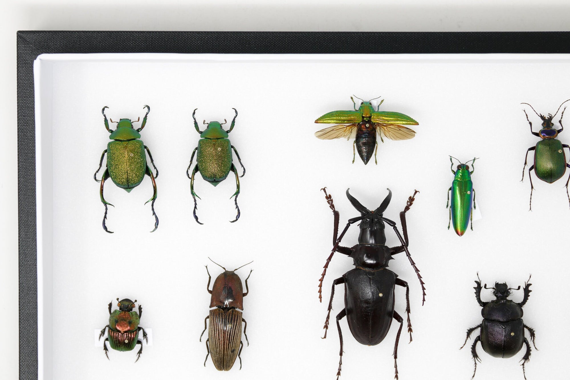 The specimens are pinned into position on a special entomology plastazote superior closed-cell sheet, and can even be removed or rearranged within the display case.